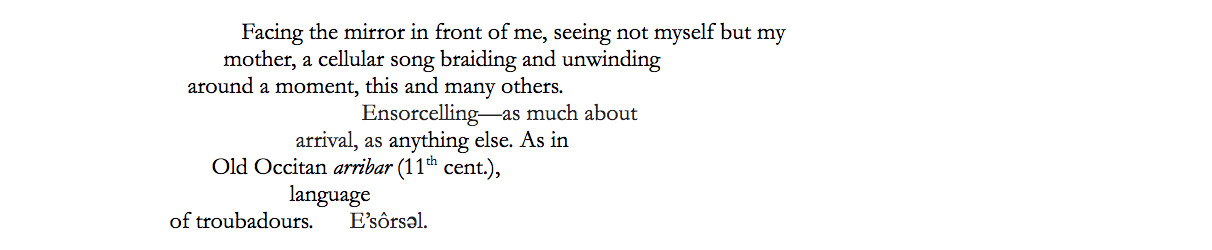 What’s striking about these lines is how each participial phrase lacks a subject; the clauses stack up on each other, like the tectonic plates in “Specula,” yet they find nothing to modify. The absence of an agent suggests that the braiding and unwinding of cellular strands possesses no physical continuity – only a handful of notes, like the music of Starzinger’s shifting earth (it’s no coincidence this poem is titled “Vocal Balance.”) As soon as the poet’s voice reaches its emotional peak, it refocuses, shifts into a more scholarly, academic gear. This pattern of genealogical and etymological tunneling also connects our bodies to lineages older than our parents and our children’s children. The word “Ensorcelling,” that strange encounter in this stanza, means enchant; it is also the origin of sorcerer. The enchantment of such a word is to expose the striations of time that exist within it, just as all words contain old engravings of meaning. Words are fossils, Starzinger suggests, meant to be excavated, their histories studied. It becomes clear why Starzinger’s etymological rabbit holes are so exciting – she’s extending the physical self beyond its veins, asking us to reposition the timeline of the self, to place our bones and language within a deeper sense of history.